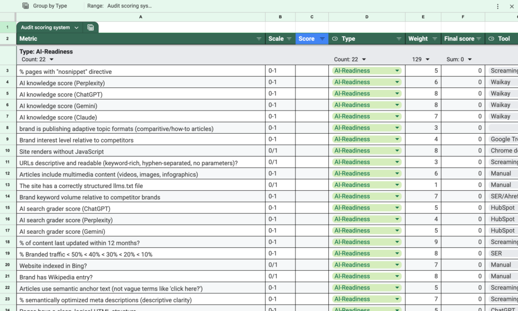 You can use this audit template to assess your brand’s GEO strength and measure how well-aligned your website and content are to the demands of AI-first search.